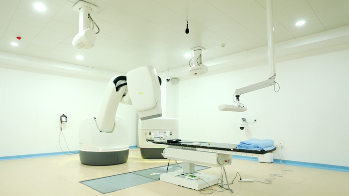 第6代射波刀又称“放射外科手术机器人系统”,是目前全球最新型的,也是我国目前引进的唯一一台全数字化带有完全靶区适型多页光栅的全身立体定向放射外科治疗设备。能根据不同患者的个体特征,量身定制不同的治疗计划,在治疗过程中,雕画出肿瘤的范围,利用机器人手臂的全向投照能力,对肿瘤进行立体雕刻式动态追踪治疗,最大范围避免对周围危及器官和正常器官的照射损伤,达到精准治疗的目的。
