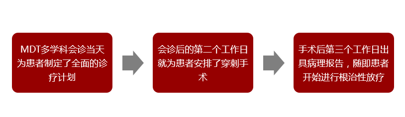 通过我院个案管理师的对接支持,患者在我院会诊后的第二个工作日就为其安排了穿刺手术。之后第三个工作日,患者家属就拿到了病理报告。患者顺利按之前MDT制定的诊疗计划进行根治性放射治疗。